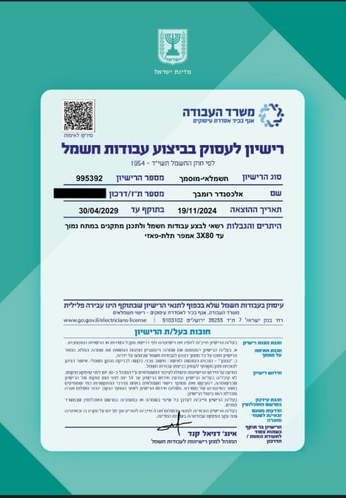 ✅ חשמלאי מוסמך עם רישיון בתוקף